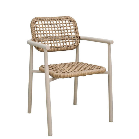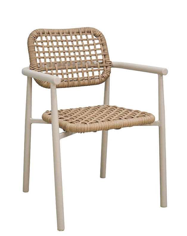 Moderní židle klasického typu s područkami. Má robustní hliníkový rám s práškovou barvou a venkovní syntetický výplet. Je snadno stohovatelná. Ideální židle pro restaurace a kavárny!